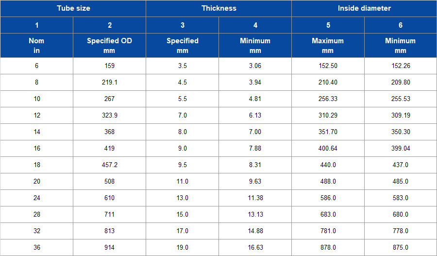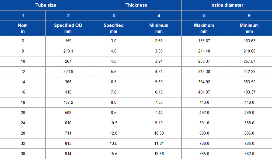 Dimensions of seam-welded 90/10 Cu Ni tubes: 20 bar rating